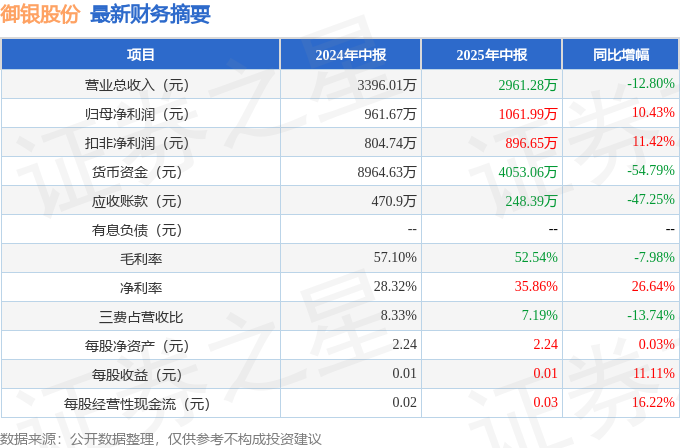 发布日期:2025-08-27 11:36 点击次数:100据证券之星公开数据整理,近期御银股份(002177)发布2025年中报。凭据财报显现,御银股份净利润同比增长10.43%。放弃本敷陈期末,公司营业总收入2961.28万元,同比下跌12.8%,归母净利润1061.99万元,同比高涨10.43%。按单季度数据看,第二季度营业总收入1427.52万元,同比下跌15.87%,第二季度归母净利润404.83万元,同比高涨2.63%。